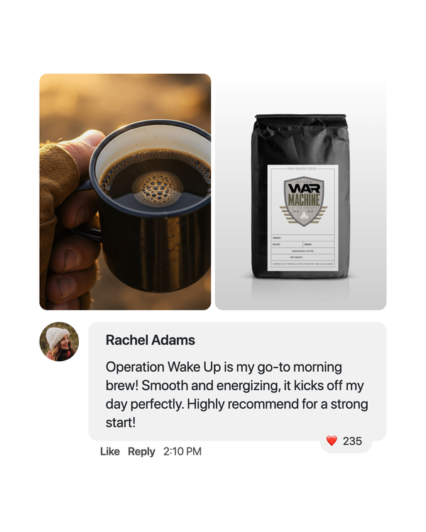 "The perfect blend of strength and flavor — I’m hooked on this coffee! It’s got that powerful aroma that hits before the first sip and a taste that keeps you coming back. Whether it’s early mornings or long nights, War Machine Coffee keeps me sharp and fueled. You can taste the pride and precision in every bag."